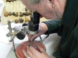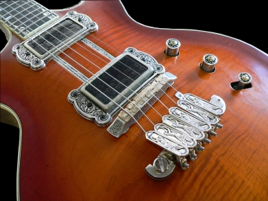 Excluding electrical components and some mechanical parts (screws, washers, frets, etc.) we design and produce every part of our instruments, including bridges, tailpieces, pickup rings, tuner knobs, tuning machine housings, strap pegs, control knobs, switch tips and inlays. Most of our metal parts are made of solid sterling silver.